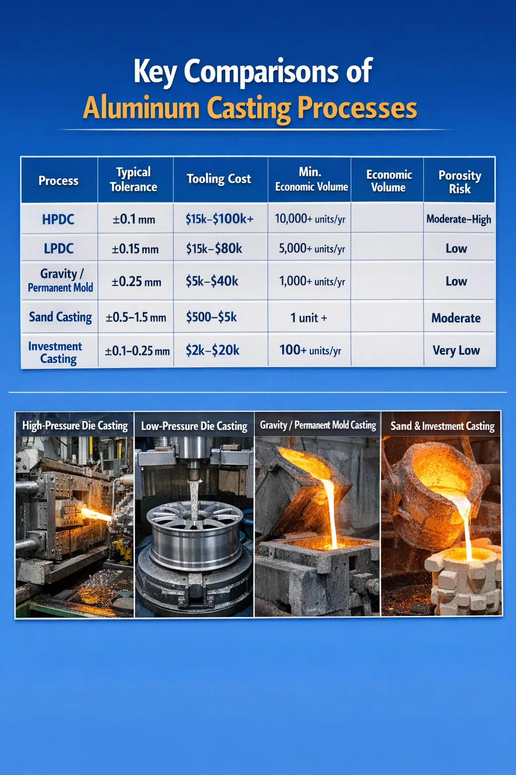 | LPDC | ±0,15 mm | US$ 15.000 a US$ 80.000 | 5.000 unidades/ano | Baixo |