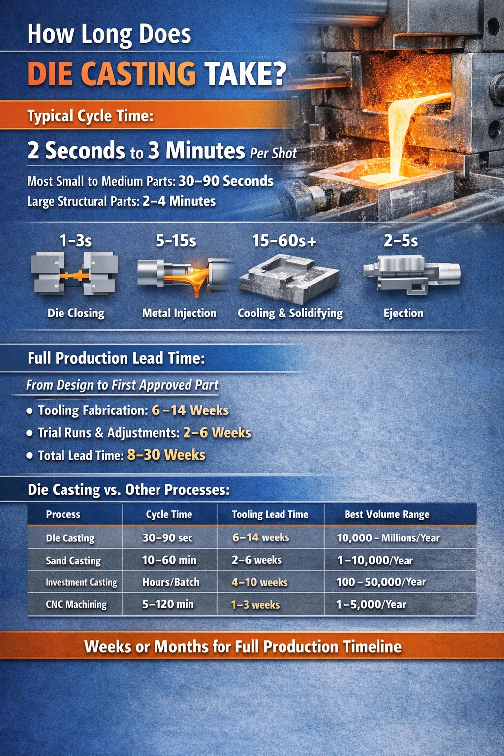 Esse número de tempo de ciclo conta apenas parte da história. Antes que a primeira peça boa saia da linha, uma operação de fundição sob pressão envolve a fabricação de ferramentas (que pode levar de 6 a 14 semanas), configuração da máquina, pré-aquecimento da matriz, disparos de teste e validação dimensional. Desde o projeto bruto até a peça de produção aprovada, o cronograma completo é medido em semanas ou meses, não em segundos.