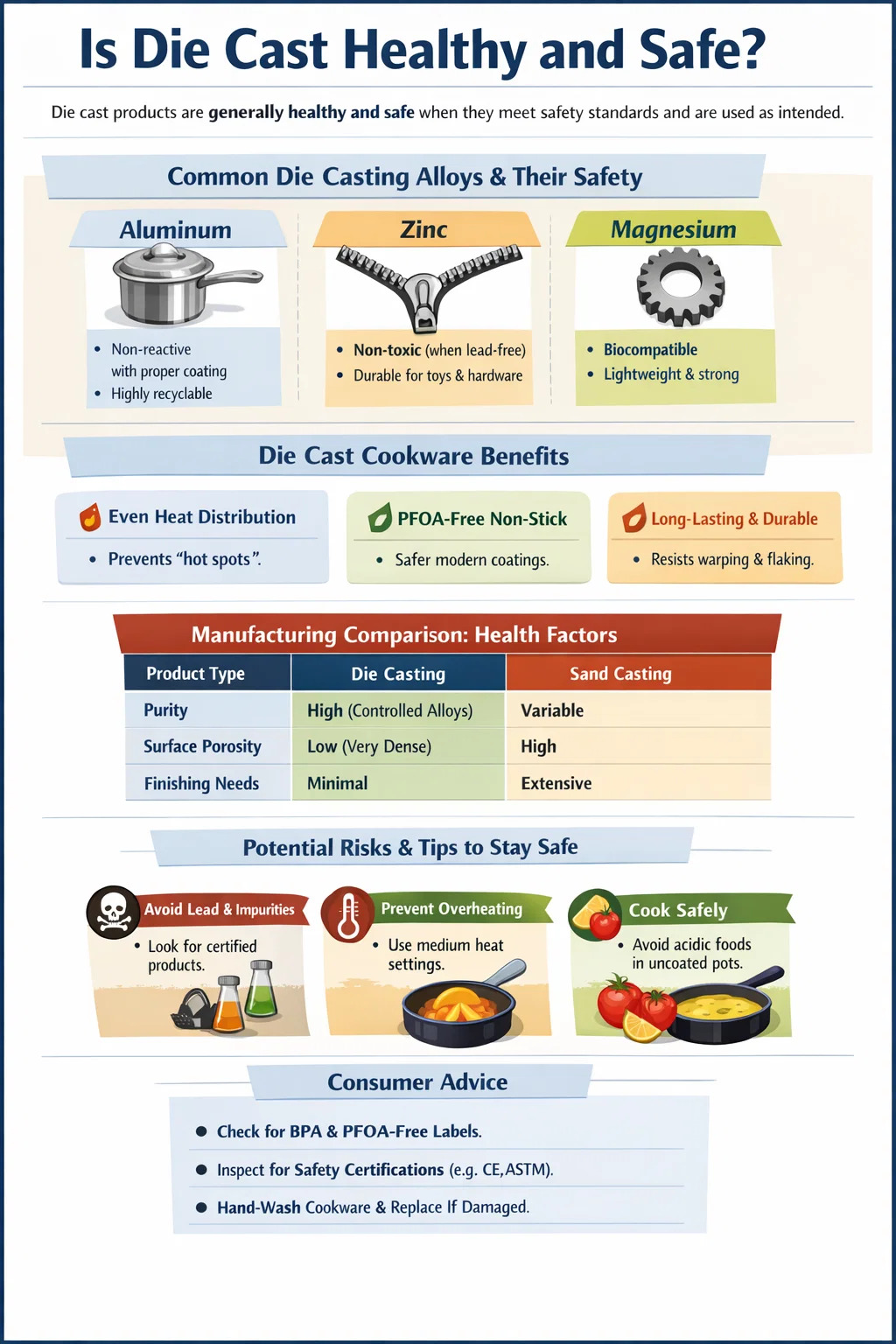 De um modo geral, os produtos fabricados através fundição sob pressão são considerados saudáveis e seguros para uso diário, desde que atendam aos padrões internacionais de segurança e sejam usados conforme pretendido. A "saudabilidade" de um item fundido depende principalmente do metal base utilizado (como alumínio, zinco ou magnésio) e do tratamento de superfície aplicado a ele. No contexto de utensílios de cozinha, o alumínio fundido é altamente popular porque não é reativo quando revestido adequadamente, enquanto em brinquedos e ferragens, o zinco fundido é preferido por sua durabilidade e falta de aditivos tóxicos como o chumbo.