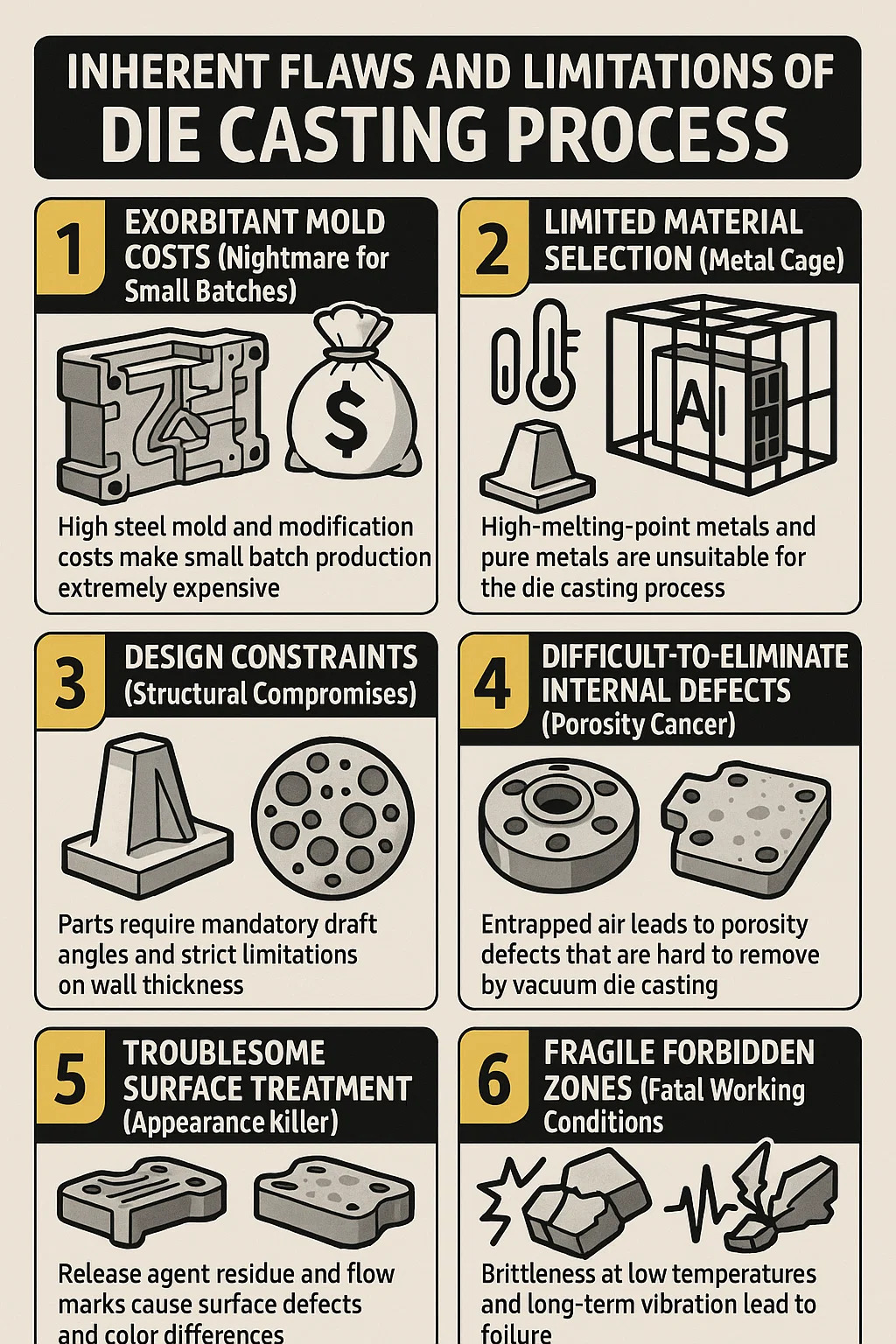 Limitações de espessura da parede: Muito fina (<0,5mm) impede o preenchimento completo com alumínio fundido, e muito espessa (>15mm) produz inevitavelmente cavidades de contração; os designers são forçados a calcular meticulosamente cada milímetro.