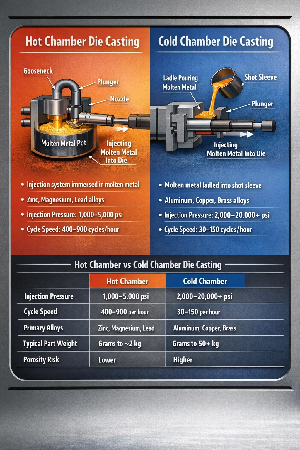 Os dois métodos básicos de fundição sob pressão são fundição sob pressão em câmara quente e fundição sob pressão em câmara fria . Esses dois processos compartilham o mesmo objetivo fundamental – forçar o metal fundido em uma matriz de aço endurecido sob alta pressão para produzir peças precisas e repetíveis – mas diferem significativamente na forma como o metal é fundido, manuseado e injetado. Escolher o método errado para sua liga ou geometria de peça pode resultar em preenchimento deficiente, porosidade excessiva, desgaste prematuro da matriz e taxas de refugo dispendiosas. Compreender o que separa esses dois métodos é o ponto de partida para qualquer decisão séria sobre fundição sob pressão.
