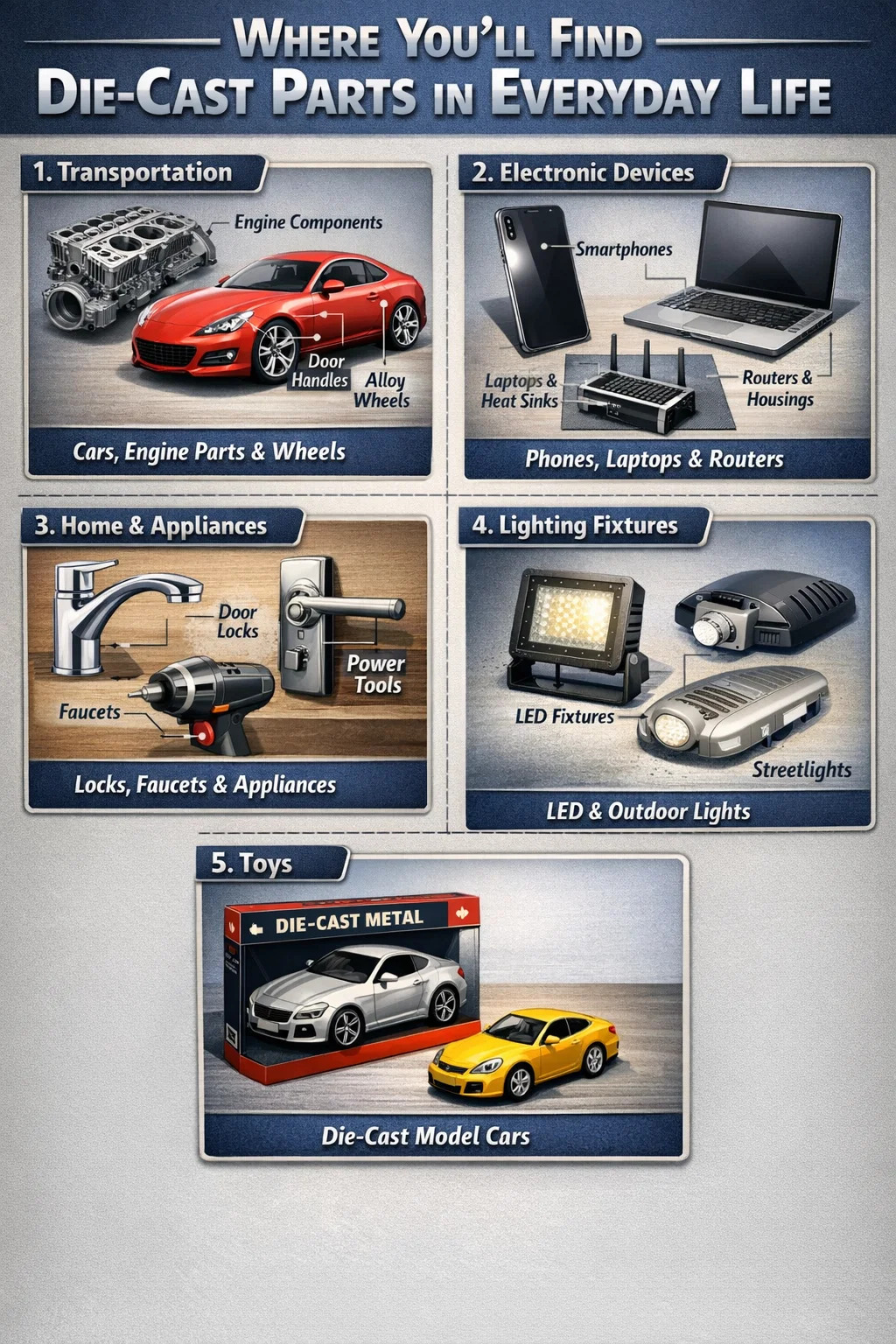 Fundição sob pressão é usado principalmente para fabricar itens que exigem durabilidade, formas precisas e produção em massa. Aqui estão alguns dos usos mais comuns em nossa vida diária: