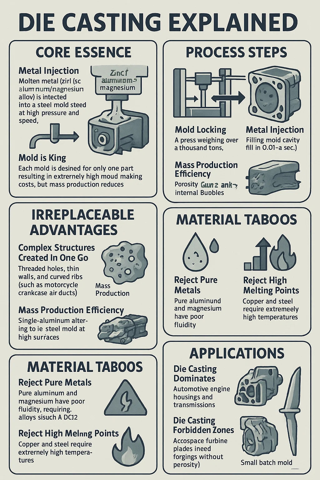 Rejeitando metais puros: alumínio puro e magnésio têm pouca fluidez, exigindo ligas (como o alumínio ADC12 com 10% de silício).