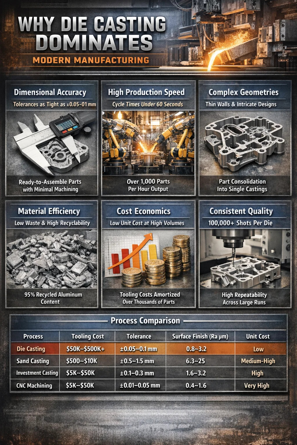 A principal vantagem da fundição sob pressão é sua capacidade de produzir grandes volumes de peças metálicas complexas e dimensionalmente precisas em alta velocidade com pós-processamento mínimo. Em um único ciclo de produção, a fundição sob pressão oferece tolerâncias rígidas, acabamentos superficiais suaves e repetibilidade consistente que poucos outros processos de conformação de metal podem igualar. Para indústrias onde a precisão e o rendimento são importantes – automotivo, eletrônico, aeroespacial, bens de consumo – a fundição sob pressão fica na interseção entre eficiência e qualidade.