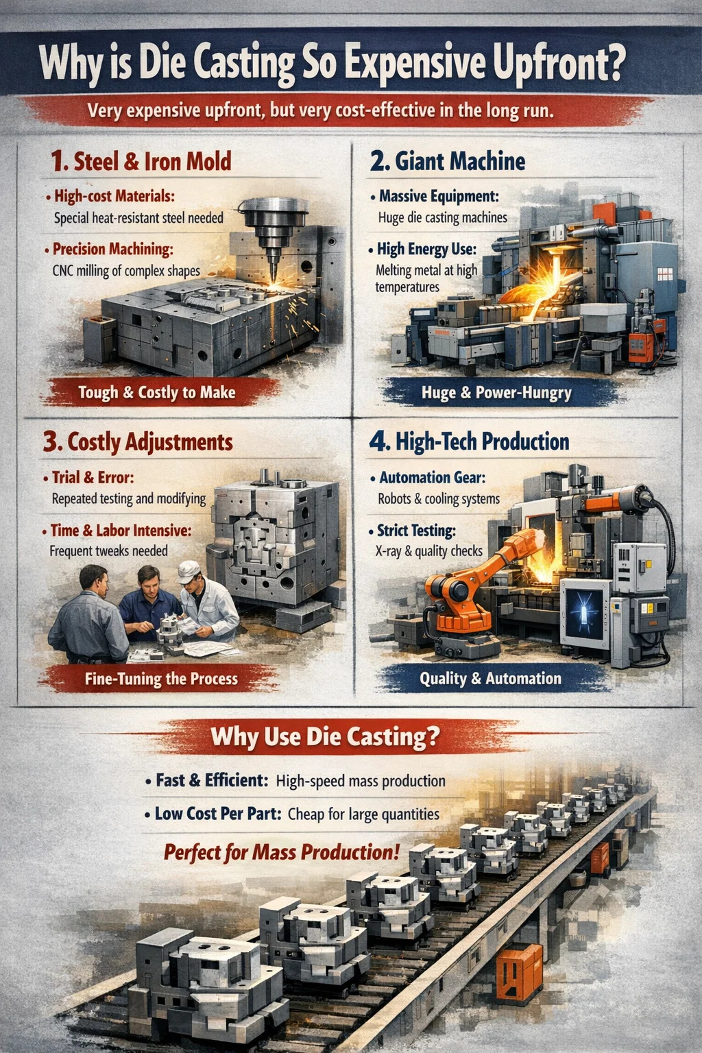 Na verdade, fundição sob pressão é de fato um processo que é "muito caro no início, mas muito econômico no longo prazo". Seu alto custo se reflete principalmente no investimento inicial. Podemos decompor esse processo:
