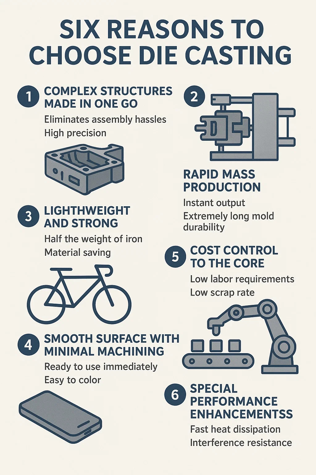 Elimina complicações de montagem: Fundição sob pressão pode criar diretamente estruturas complexas, como canais de resfriamento de motores de automóveis e slots de antena de telefone em um único molde, eliminando etapas de soldagem/rebitagem.